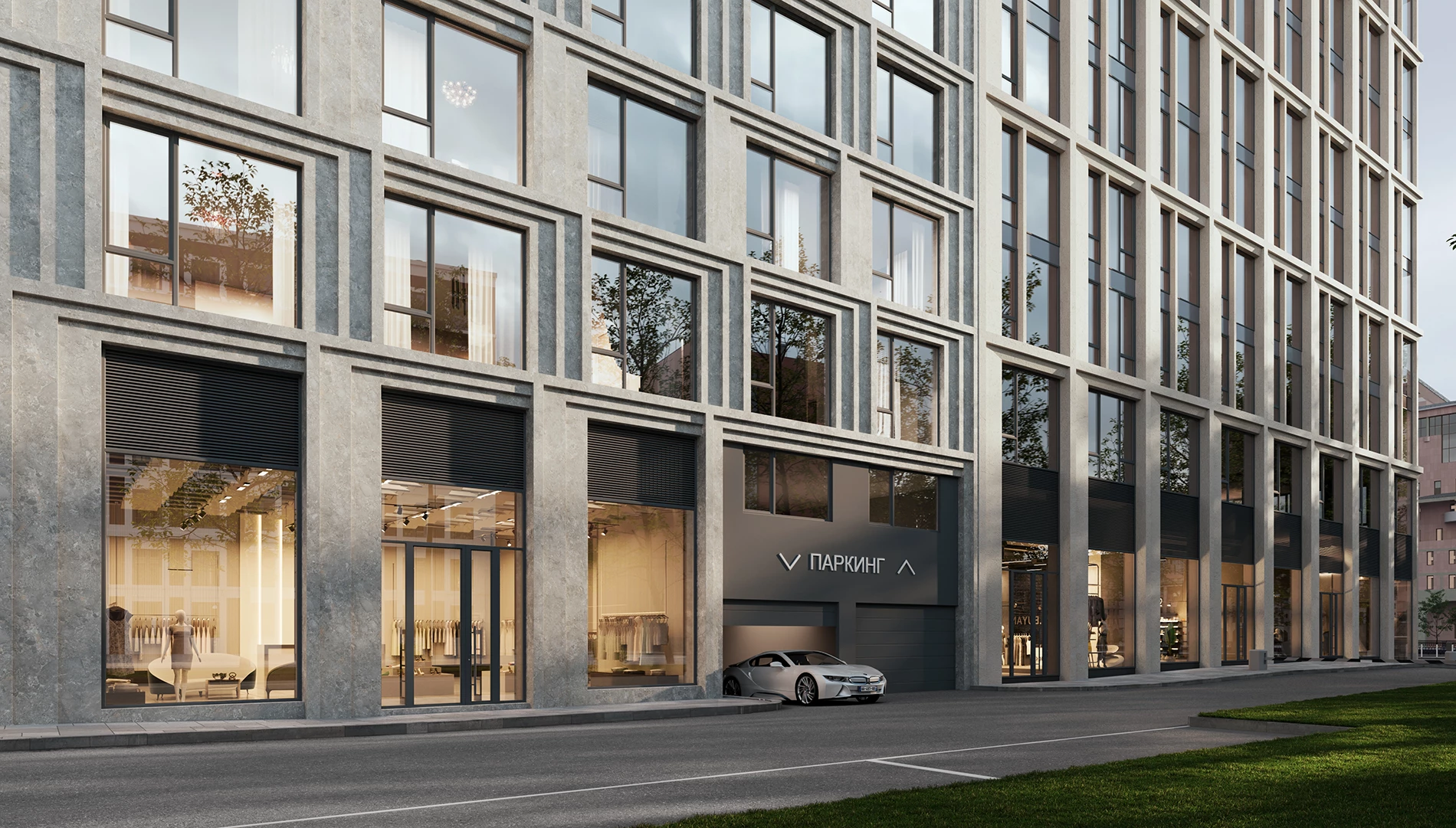 В подземной части организован двухуровневый паркинг с зарядными станциями для электрокаров