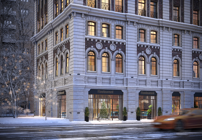 Первый этаж дома с коммерческими помещениями, также облицованный натуральным камнем, будет иметь витражное остекление. Там расположатся ресторан, кафе и бутики. На последнем, шестом этаже разместятся пентхаусы с потолками до 7,6 м и личными террасами со стеклянным ограждением.