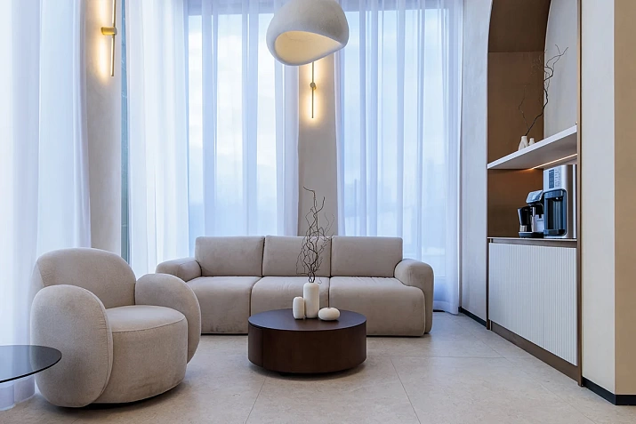 Двухэтажное здание площадью 500 кв. м со светлыми фасадами и арочными окнами созвучно архитектурной концепции «Адмирала». Дизайн интерьеров разработан бюро LIFEFORMS и выполнен в стиле «джапанди», для которого характерна минималистичная цветовая палитра и природные оттенки.
