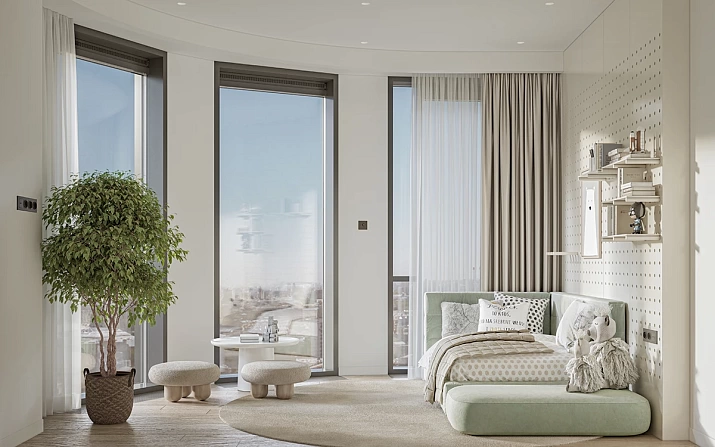 Всего в комплексе 510 квартир — от студий 27 кв. м до просторных лотов с четырьмя спальнями площадью 130 кв. м. В первом корпусе представлены варианты с дизайнерской премиальной отделкой под ключ, в двух других — без отделки. Есть уникальные форматы — квартиры с личными террасами на кровле стилобата и с потолками высотой 4,6 м на первом этаже. Также в комплексе будет двухуровневый подземный паркинг и кладовые.