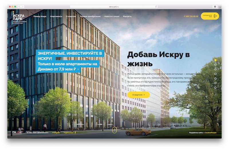 Сайт проекта «Искра-Парк» (собственник и девелопер – компания «Галс-Девелопмент») www.iskra-park.ru занял первое место в премии «Рейтинг Рунета» в номинации «Строительство и недвижимость». Новый сайт проекта разработан весной 2016 года креативным агентством Creative People.