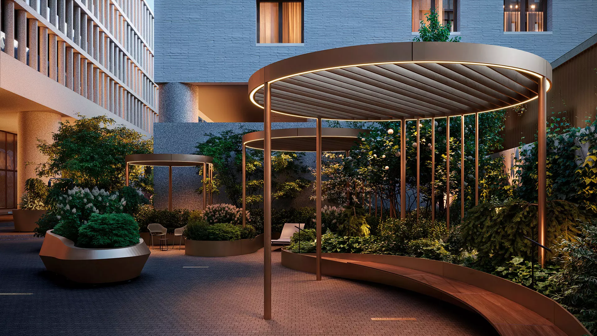 Пространство двора организовано на двух уровнях. Верхний — исторический, с палатами, где будет устроена детская площадка, и нижний, — приватный сад для тихого отдыха и расслабления резидентов. Двор-сад задуман как пространство, где совершенно исчезает ощущение времени. Пышное озеленение, фонтан с большим деревом словно частный арт-объект, срытые от глаз «зелёные кабинеты», зона секретного сада с водным переливом — всё здесь настроено на уединение и внутреннюю паузу. Такое качество покоя — редкая, почти невозможная роскошь для самого центра города.
