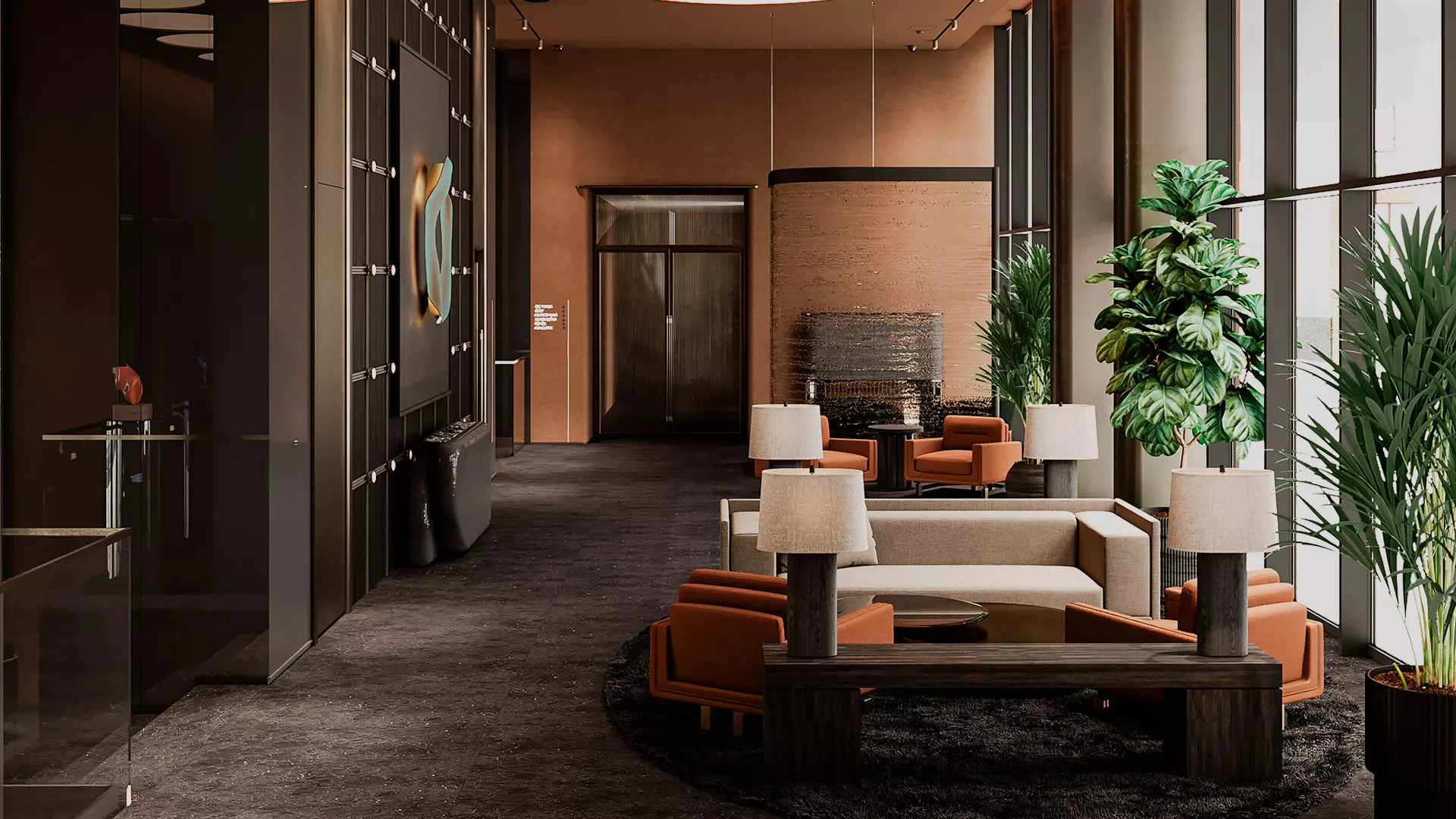 Гранд-лобби от Архитектурного бюро Олега Клодта выполнено в стилистике «тихой роскоши» с японскими и скандинавскими сдержанными мотивами. Оно состоит из зоны ресепшн и нескольких пространств на двух уровнях для отдыха и деловых встреч резидентов. Его глубокие природные оттенки — терракот, тёплый графит, приглушенный серо-бежевый — и богатые текстуры натурального камня, латуни, зеркал в отделке создают атмосферу спокойствия и силы. Здесь царит обволакивающая дорогая тишина.