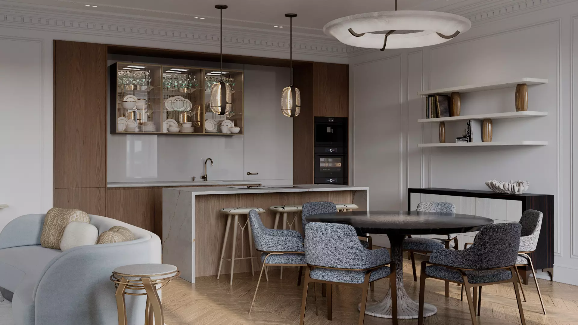 Светлая палитра отличается цветом стен — это благородный светло-серый с медитативной сдержанностью. При свете он раскрывается мягкой теплотой. Светлый мрамор и дубовый паркет «ёлочкой» дают ощущение тепла и уюта.