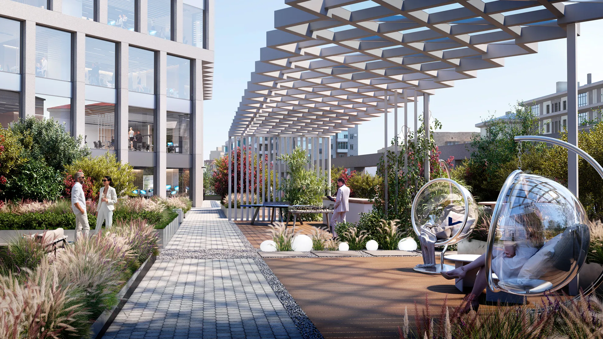 На кровле стилобата появится возможность организации «зелёной гостиной» с уличными диванами и креслами, коворкингом под открытым небом, лаундж-зоной и площадкой для мероприятий. Для спокойного и уединённого отдыха можно оборудовать специальные беседки-перголы*.